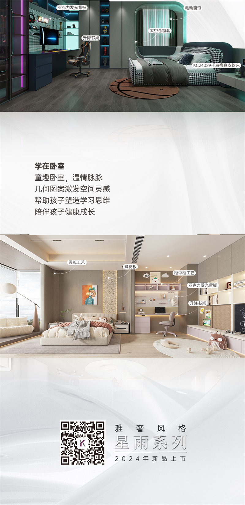 2024年新品係列,星雨 |雅奢風格 該係列產品采用柔和的色彩搭配和浪漫的元素點綴,打造溫馨浪漫的家居氛圍。樂在臥室:潮玩魅力 炫酷聚集 娛樂遊玩 精彩無限 讓個性為臥室下定義 開啟高質量宅家度假模式
