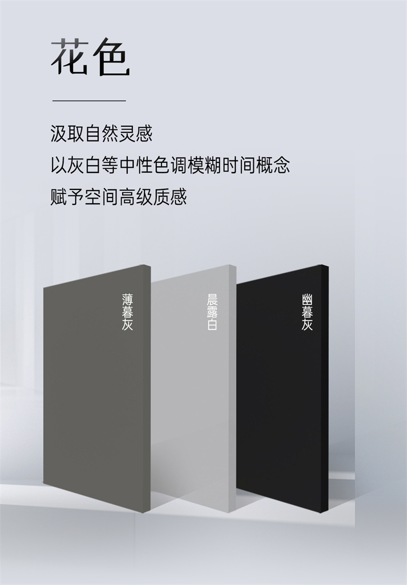 色彩:灰白色係搭配,以其深邃質感,相互交織映襯,營造出一種超越世俗的靜謐與高雅的整體氛圍。