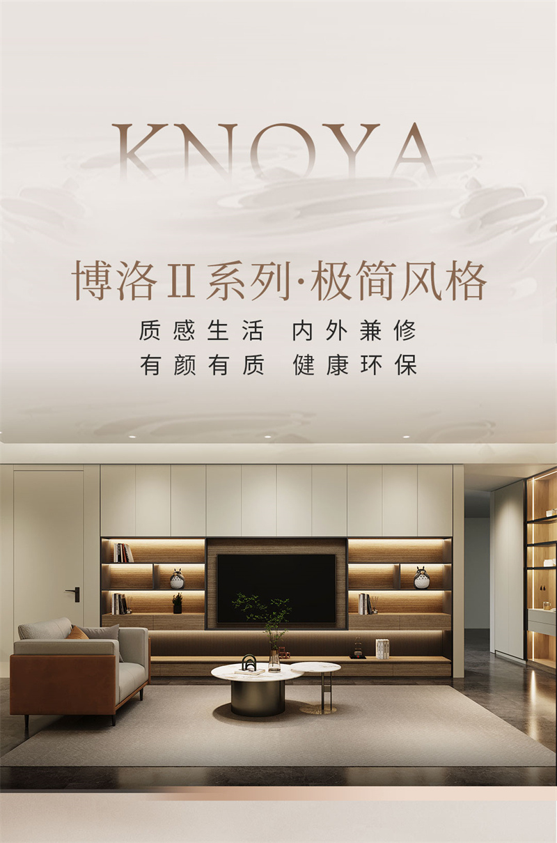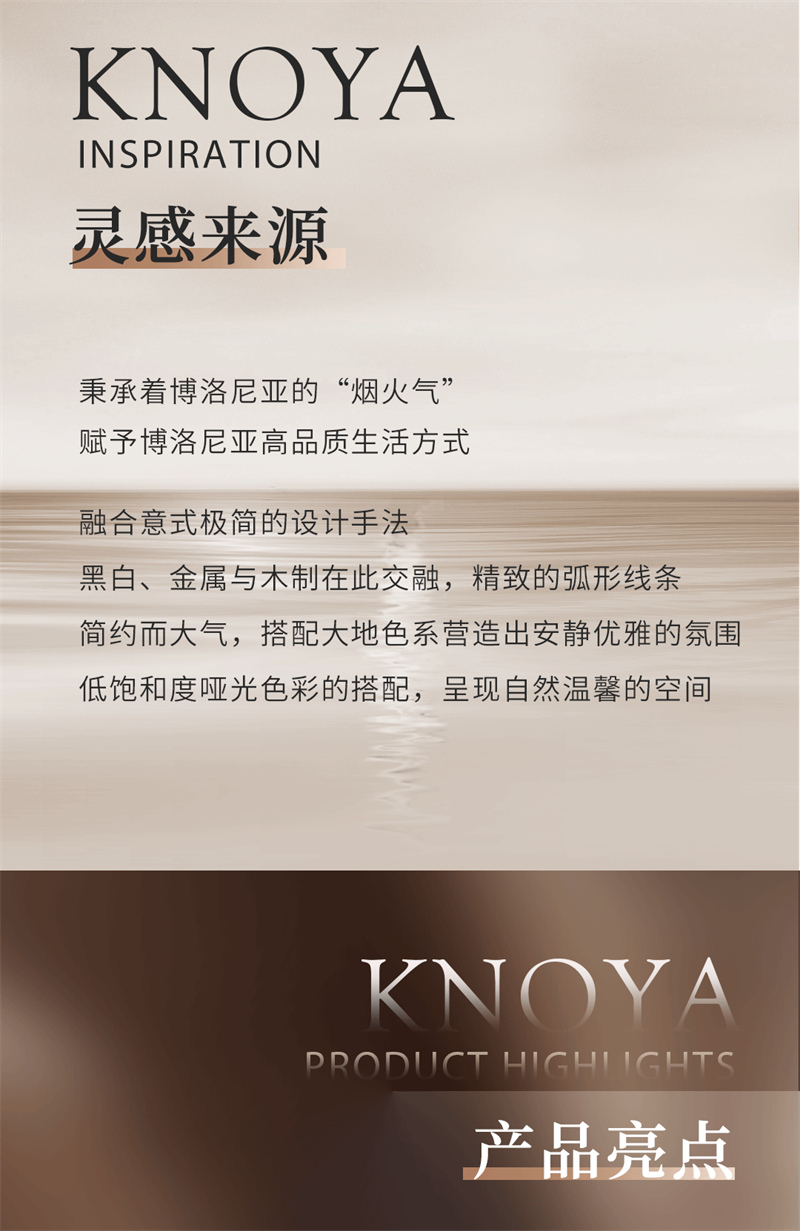博洛Ⅱ | 極簡風格質感生活 內外兼修 有顏有質 健康環保融合意式極簡的設計手法,黑白、金屬與木製在此交融,精致的弧形線條簡約而大氣,搭配大地色係營造出安靜優雅的氛圍,低飽和度啞光色彩的搭配,呈現自然溫馨的空間。