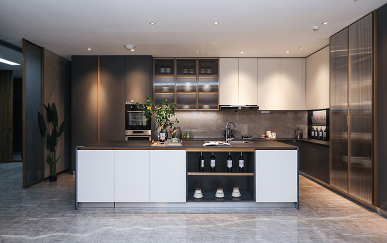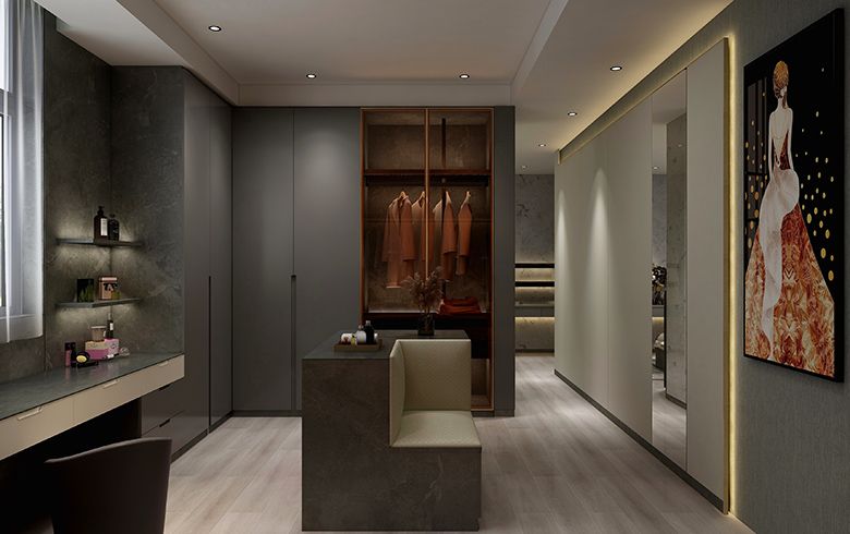 櫃體及門板采用“黑金剛/睿墨”ד雅杏”經典黑白配,越簡約越高級。中間鏤空設計,擺放常用的鞋子、飾品、綠植等,裝飾每天好心情。茶色玻璃、銅色邊框點綴,空間通透中顯輕奢。