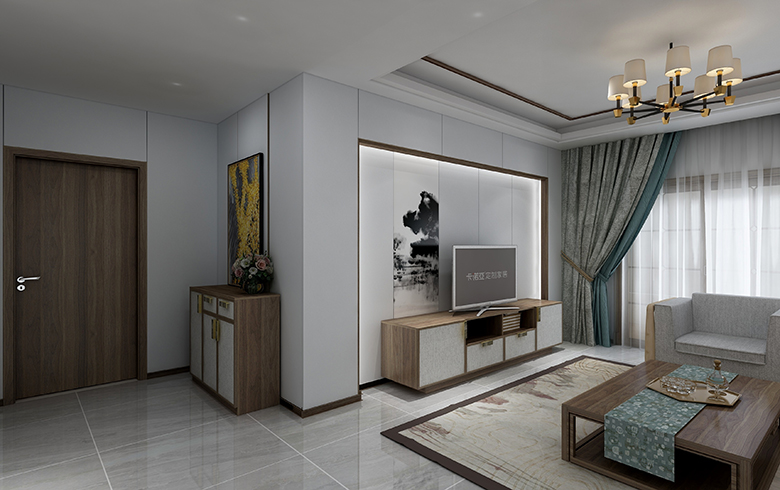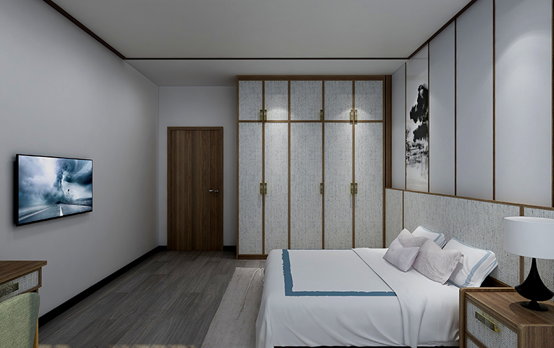 護牆係統由簡潔大方的印象白與禦品木拚接而成,加上山歌墨舞等中式元素的運用,將整個新中式臥房空間點綴的莊重而優雅。