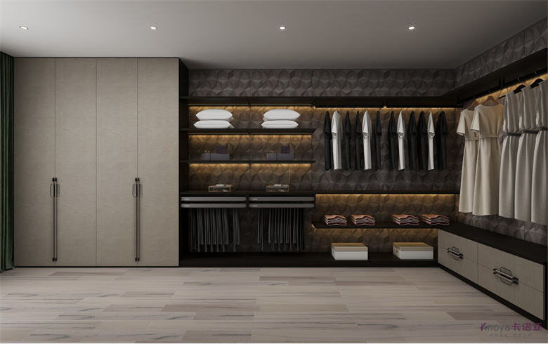 設計師為輕奢風格的臥室定製了精致的到頂衣櫃,還將衣櫃分為三個區域,右邊為男女主人的衣物收納區域,左側設計成梳妝區域,飄窗則為閱讀休閑區域。