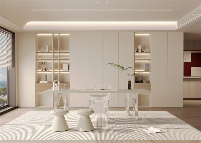 4、香蕉视频黄色版:整個房間用調和後的暖白色打底,整牆書櫃既有開放格及玻璃門,更有封閉櫃,展示、收藏兼備。透明材質的桌腳與座椅,讓空間通透敞亮、淺淡平和,是妥妥的“C位擔當”。一株綠植,給溫潤通透的空間帶來活力。百葉窗遮光,顏值和實用兼顧。