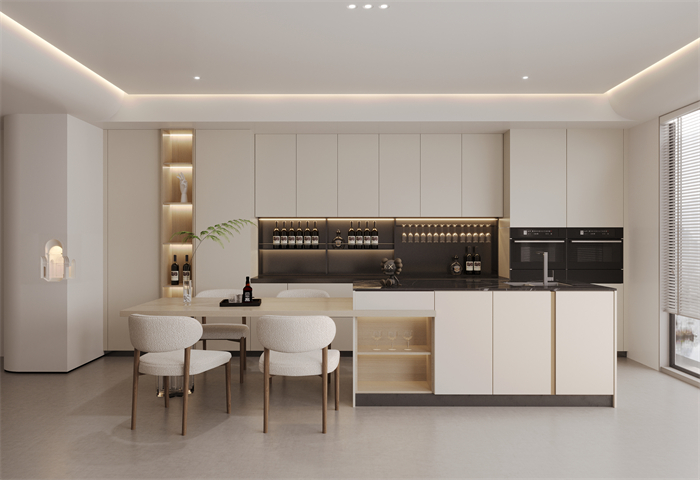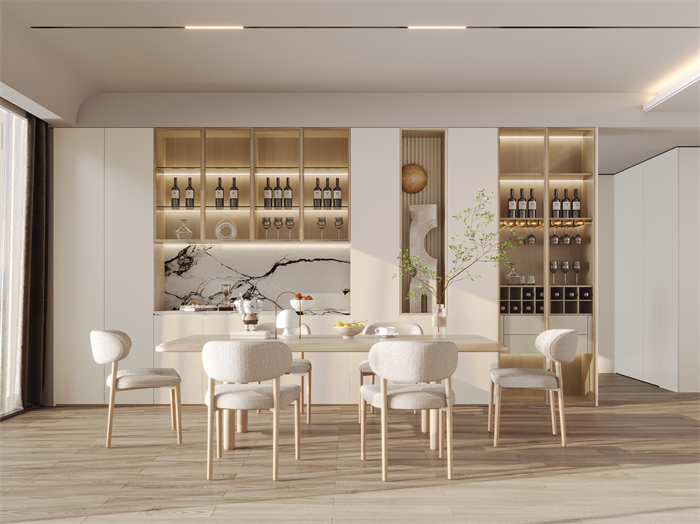 2、餐廳:純粹簡雅的奶油白配色,輕鬆營造愉悅的就餐氛圍。餐酒櫃三段式設計,上半段帶玻璃門、燈帶,適用於展示美酒、飾品,加上凹槽處藝術3D掛畫,品味格調凸顯,高級感拉滿;中間鏤空處台麵,可用做收納、水吧台、小電器等;下半段抽屜較多,收納更強。