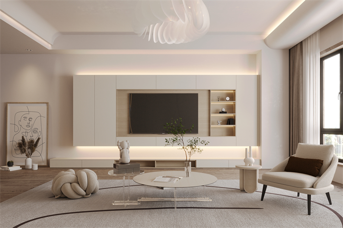 大麵積的木色地板搭配米白色沙發、地毯,再加上一點深色做點綴,讓空間色彩具有層次感,溫和又治愈。沙發背景牆采用前後疊加設計,局部裝凹凸格柵板,別出心裁的圓弧板嵌入其中,柔化棱角的硬冷,隱藏式燈帶透射出暖光,讓空間造型極具立體感,賞心悅目百看不厭。