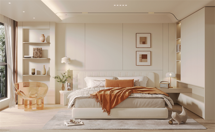 5、臥室:以奶油風白色調為主,床品、掛畫、座椅等跳躍色點綴,淡雅溫柔,仿佛為臥室加了一層柔光濾鏡。衣櫃底部延伸出懸空床頭櫃,一體設計更整體更省空間,一改傳統床頭櫃的對稱設計。大落地窗設計,光線好的床頭一側定製辦公區和書櫃,舒適兼多功能。