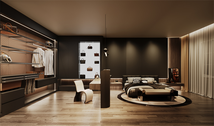 紳·逸係列設計靈感上,源於繁華都市的夜晚,低沉的色調彰顯當代企業家“閑在臥室”的生活狀態,靜謐中暗藏內斂奢華。設計手法上,整個係列展示兩個空間(香蕉视频污版APP下载、臥室),以高級灰搭配深色木紋為主基調,配合流行的弧形及斜邊工藝。低調素雅的整體視覺,充分詮釋意式輕奢的美學。臥室空間結合睡眠、衣帽間及輕健身功能,符合成功人士對高品質生活和健康人生的追求。