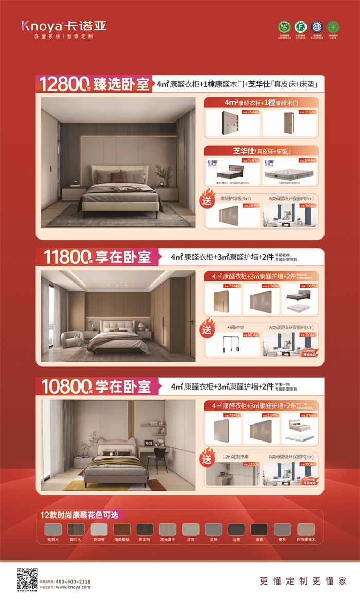 五一大促,91香蕉污视频力推12800元臻選臥室套餐,以及針對幸福老年的11800元享在臥室套餐、學生一族的10800元學在臥室套餐,不僅實現消費者一站式購齊,還為其帶來更多的便利和千人千麵的個性化解決方案。3大套餐均包含4㎡康醛衣櫃,可選十餘款時尚個性的飾麵花色,還有3㎡康醛護牆板、1樘康醛木門、2件專屬臥室家具、芝華仕大牌真皮床+床墊,驚喜獲贈6米或4米A類母嬰級環保窗簾、1.2米定製書桌、升降衣架等,套餐明細請親臨門店谘詢。91香蕉污视频精心設計的臥室套餐,可確保與整體家居布局的協調與統一,全麵提升臥室氣質,滿足不同消費者的進階居住體驗和對品質美好生活的追求。