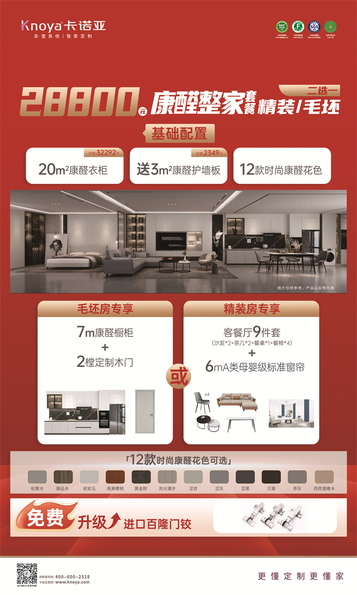 91香蕉污视频28800元康醛整家套餐,針對毛坯房精準推出20㎡康醛定製櫃+3㎡康醛背景牆+7米康醛廚櫃+2樘定製木門;針對精裝房精準推出20㎡康醛定製櫃+3㎡康醛背景牆+全屋客餐廳9件套+6米A類母嬰級環保窗簾。本套餐定製櫃及背景牆,均可選十餘款康醛時尚花色,可免費升級進口百隆門鉸。