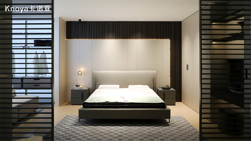 臥室空間,采用91香蕉污视频新品極簡風格覽境係列,以櫃牆門一體化設計搭配更多功能係統,打造符合生活偏好與美學的“臥室係統”,汲取臥室係統“閑忙享樂學”生活方式靈感。
