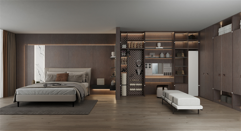 產品亮點:1.鬆韻、耀金、秋香木等溫潤色調巧妙組合,構築“雅而不寡” 的視覺基調,營造溫馨高雅的空間氛圍。2.采用進口榆木木皮,呈現自然美觀的質感,且具備環保健康、耐用性強、個性造型等優點.3.金屬水性漆環保健康, 3底2麵的塗裝工藝,裝飾空間質感更高級。4.獨特斜向切割麵與門型設計,搭配 25mm超導發光層板、宣紙發光板及ABA夾心工藝等,演繹“Less is more”的輕高定美學,展現精致簡約的空間格調。