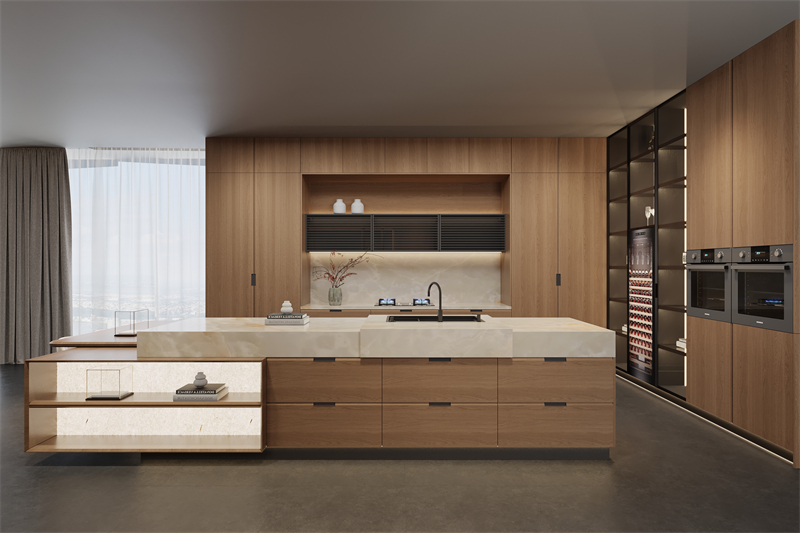 產品亮點:1.形:K冕拉手門型將冠冕與K字原創設計相結合,巧妙傳遞品牌的尊榮之意。2.質:甄選天然木皮,其天然紋理與自然色彩,賦予空間沉穩深邃之感。3.氣:鑲嵌、圓弧、3D數碼打印等傳統工藝與現代技術結合,現代中式美家呼之欲出。4.韻:冰裂紋發光板的運用,宛如冰淩閃耀,映照星光,為空間增添夢幻般的詩意氛圍。5.神:中島台升降置物架、高端智能衣物護理機等智能配置,為生活帶來便捷與品質。