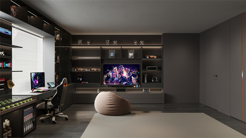 對於熱愛娛樂的活力青年,“樂在臥室” 設計融入了豐富的娛樂元素。配備了超大屏幕的電視或投影儀,打造私人家庭影院。競技區則配備可升降的電競桌椅,自適應腰托和4D 扶手可以根據身體姿勢自動調節,緩解疲勞。此外,裝備補給站就在手邊,方便拿取手柄耳機等裝備,讓你在遊戲中隨時保持最佳狀態,讓臥室成為娛樂與休閑的雙重空間。