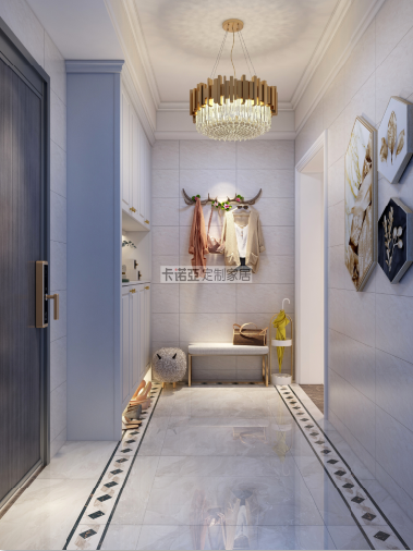 為了保持玄關空間的寬敞通透,設計師建議不做滿牆的櫃子,所以台麵上留了不少空間;設計師還為櫃門選了白色,這就不會讓空間有壓抑感。