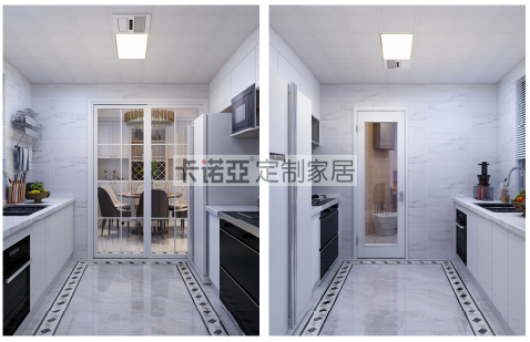改造後,采用兩條平行線型廚櫃格局,將烹飪區和洗切區隔開,方便轉身,香蕉网站免费观看污空間明顯擴大。