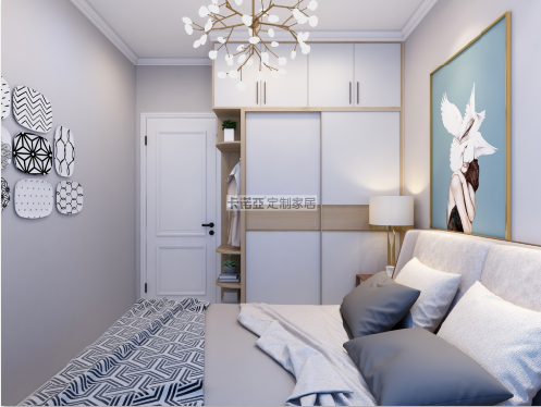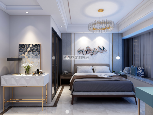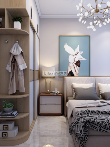 主臥有一麵超大的落地飄窗,陽光灑到床上時,就是幸福感洋溢的一刻。房間裏有梁柱和角落,定製一個藝術裝飾櫃,擺放一張藝術裝飾畫和綠植,裝飾櫃大小與梁柱正合適,讓角落也成為一道靚麗的風景線。