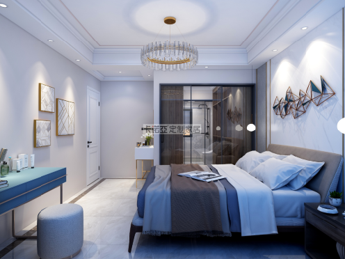 衣帽間設計在主臥與主衛之間,采用透明玻璃移門隔斷,讓主臥視野更為開闊通暢,防止濕氣侵入衣帽間及臥室,同時方便洗漱完畢可直接更衣、睡覺。