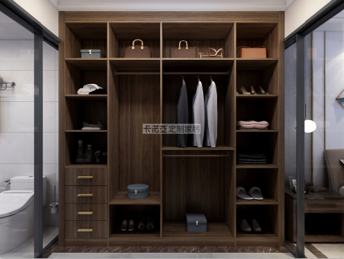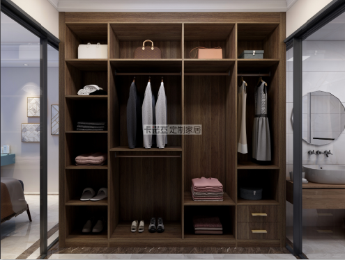梳妝台斜對麵是衣帽間,滿足日常衣物雜物的收納需求。