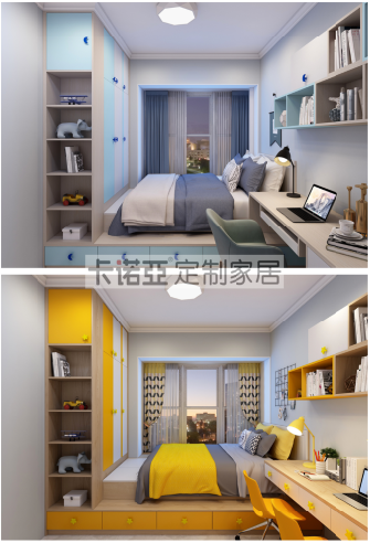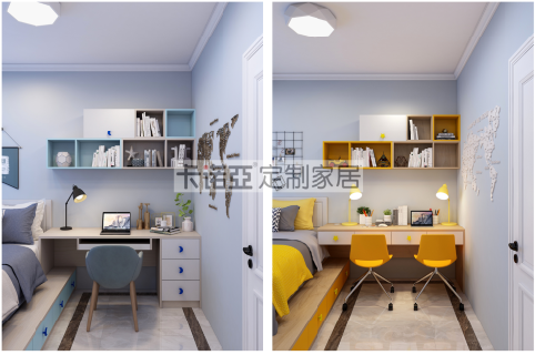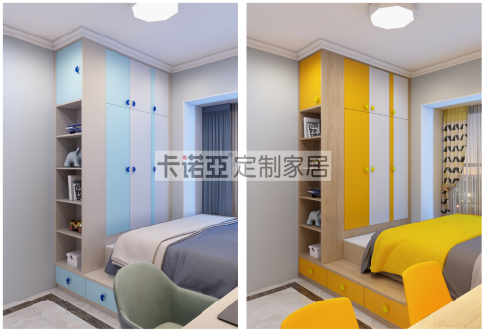 到頂衣櫃設計,滿足孩子日常衣物的收納。男孩房海天藍+印象白+淺色木紋、女孩房活力橙+印象白+淺色木紋的活力色調的組合,與房間整體配色相契合。衣櫃門側麵的開放格,用來展示玩具、孩子所獲得的獎杯及獎狀,以及記錄成長的相冊。