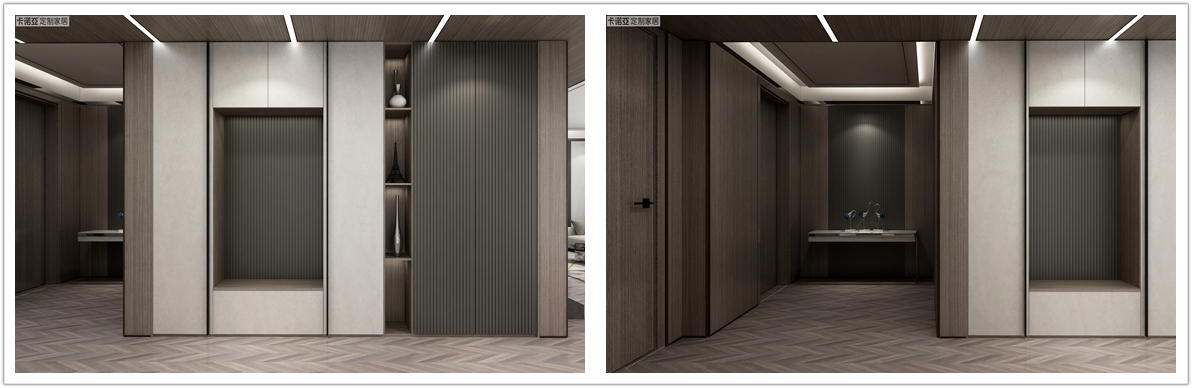 牆麵以木紋為基礎,搭配91香蕉污视频“慕尼黑”凹凸格柵護牆板,豐富了空間的層次感。方正對稱的結構設計,櫃體牆麵一體化,視覺上整體統一。