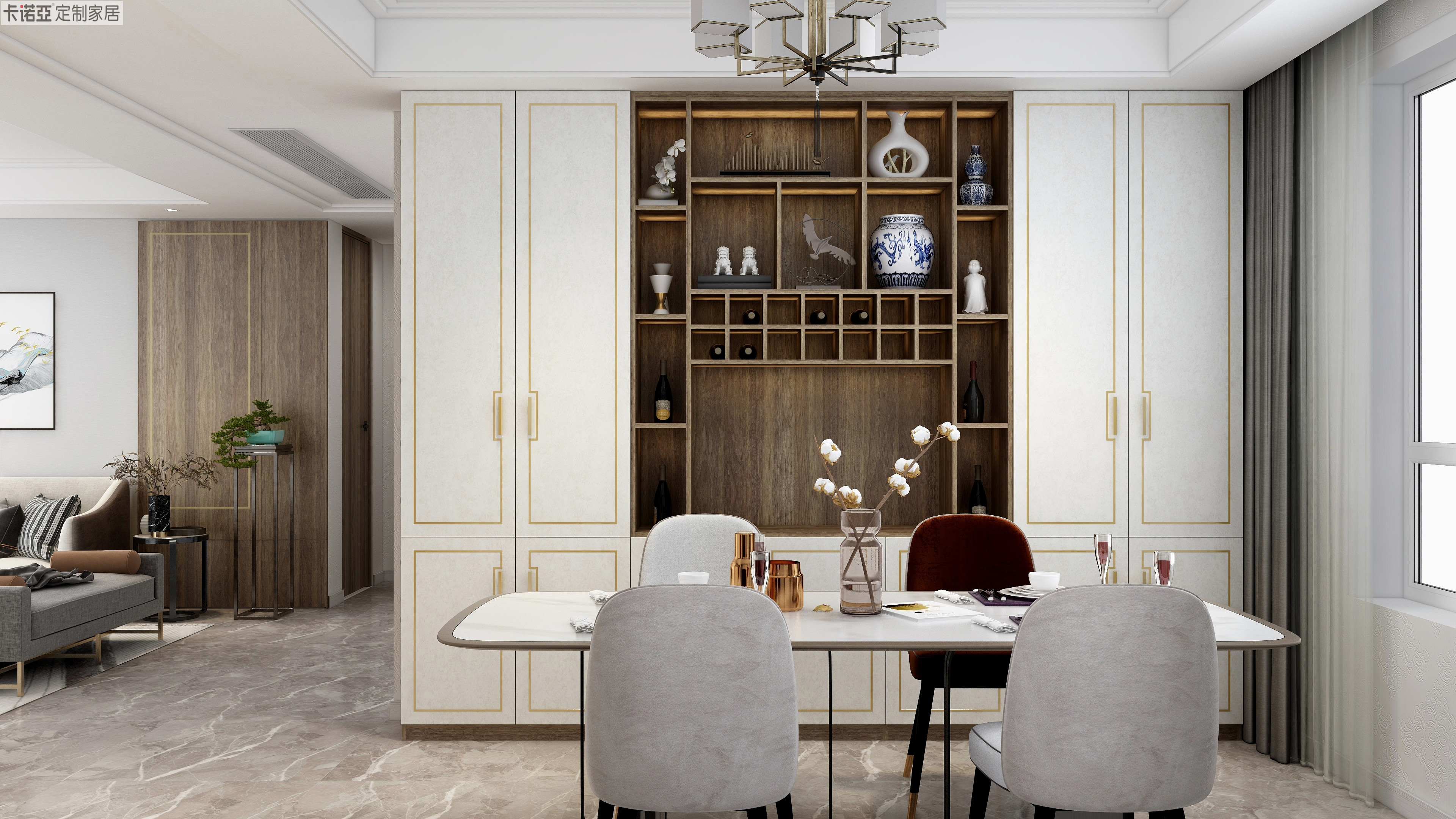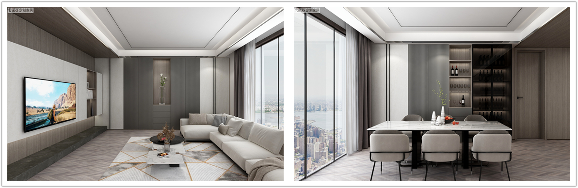 91香蕉污视频“銀絲木”大麵積運用,“慕尼黑”格柵門板作為點綴,搭配米色的沙發和白色大理石餐桌,整個空間硬朗有張力,凸顯現代都市生活注重快節奏與簡潔實用。