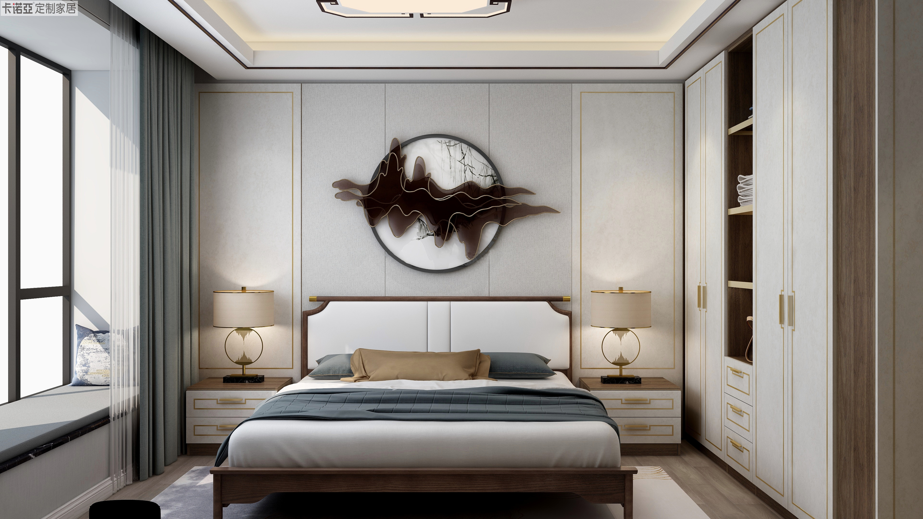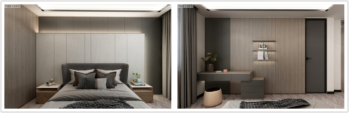 米色成為空間的主色調,輔以木紋材質,自然而舒適,營造良好的睡眠環境。回紋型金屬條及黃銅色拉手點綴空間,盡顯新中式風格的輕奢觀感。