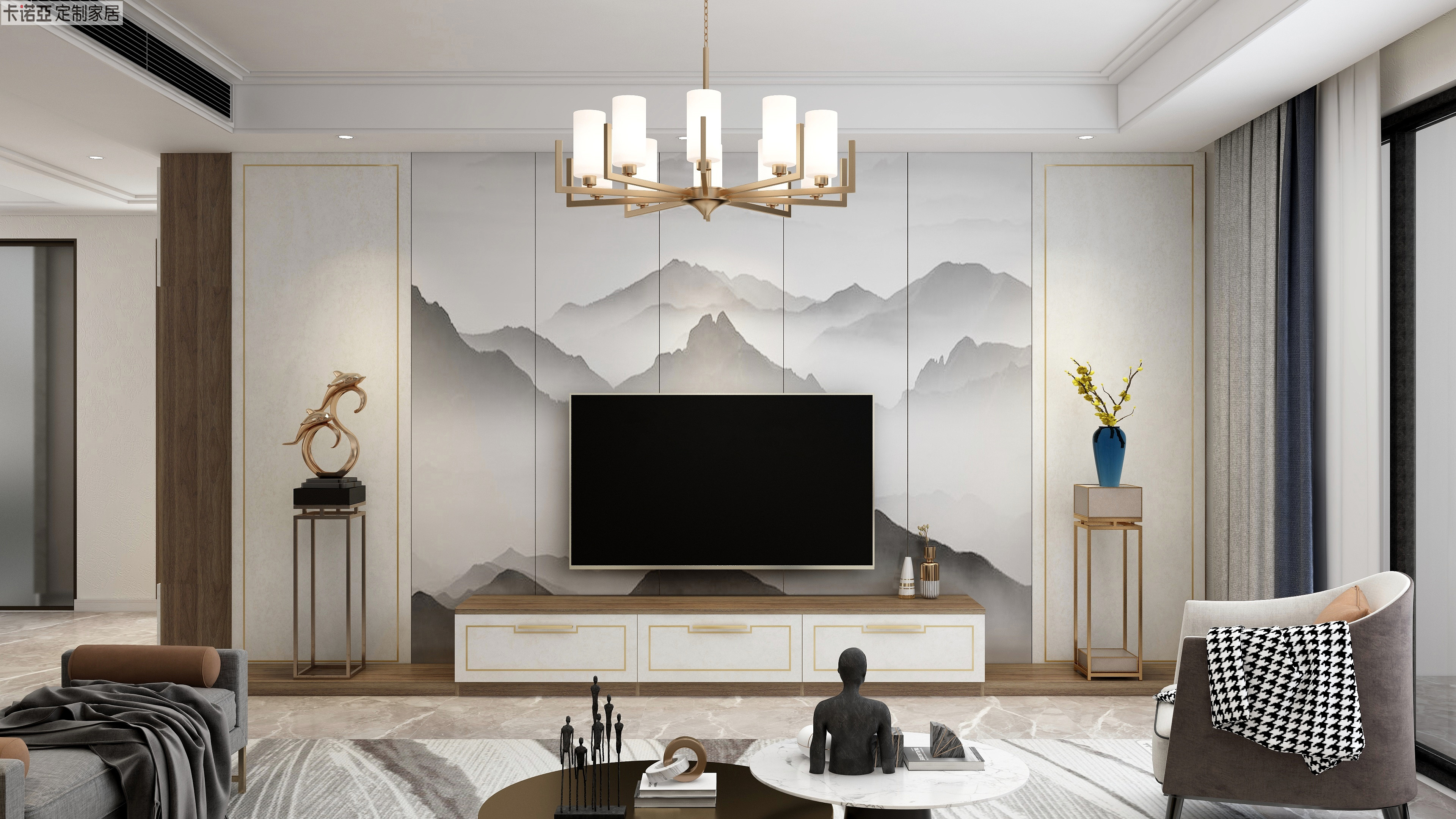 3D中式山水畫作為電視背景牆,讓人耳目一新。搭配側邊對稱的護牆板,采用回紋型金屬條的金邊勾勒,於無聲處驚鴻一瞥,營造意境悠遠的東方禪意空間。