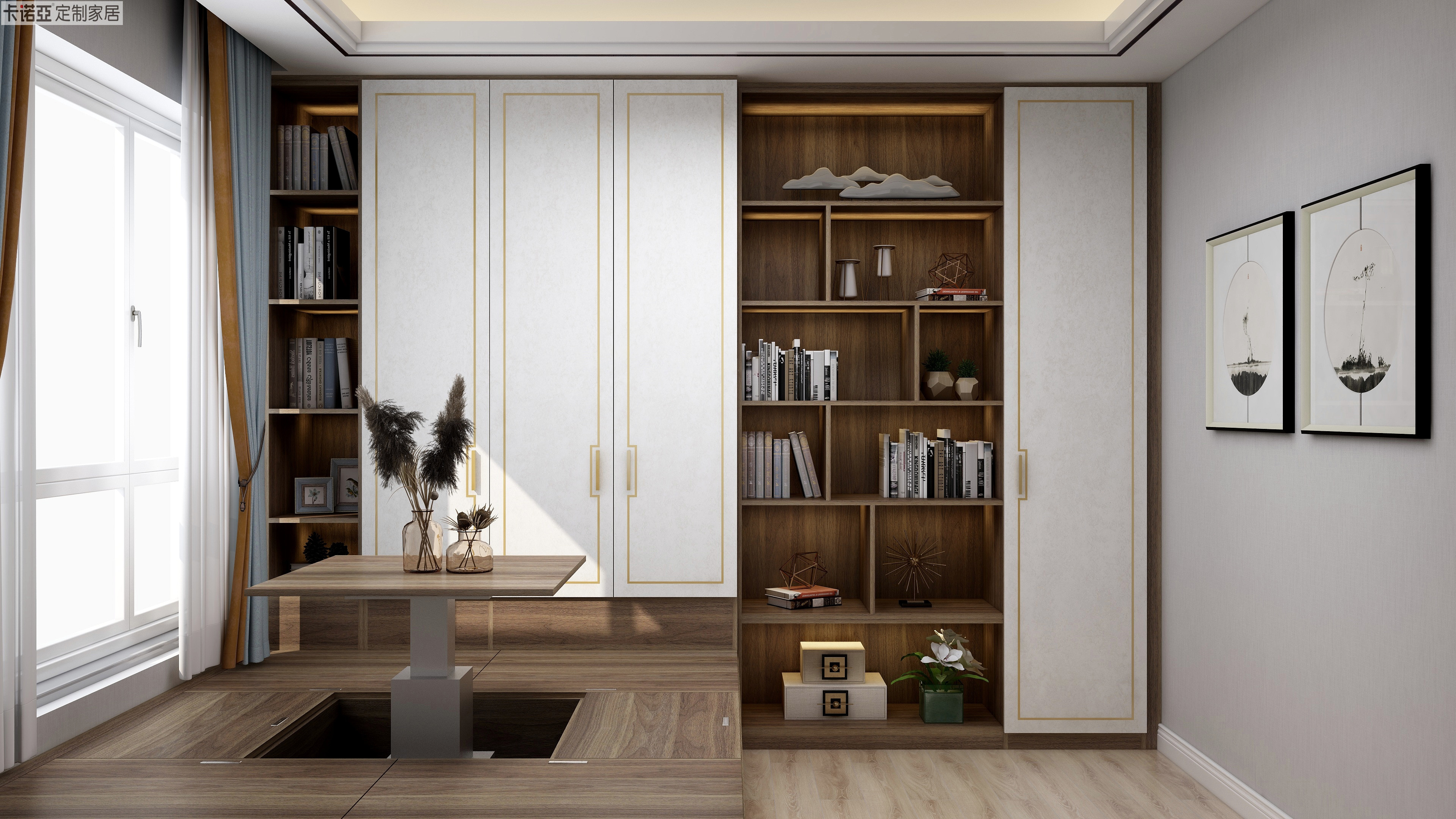 榻榻米是多功能房的不二之選,采用91香蕉污视频“禦品木”的榻榻米,彰顯東方式香蕉视频黄色版的戀木情結。與榻榻米連為一體的書櫃,櫃門采用淺色花紋,表麵同樣嵌入回紋型金屬條,加上金屬拉手的點睛,讓中式香蕉视频黄色版寧靜致遠中綻放優雅之美。