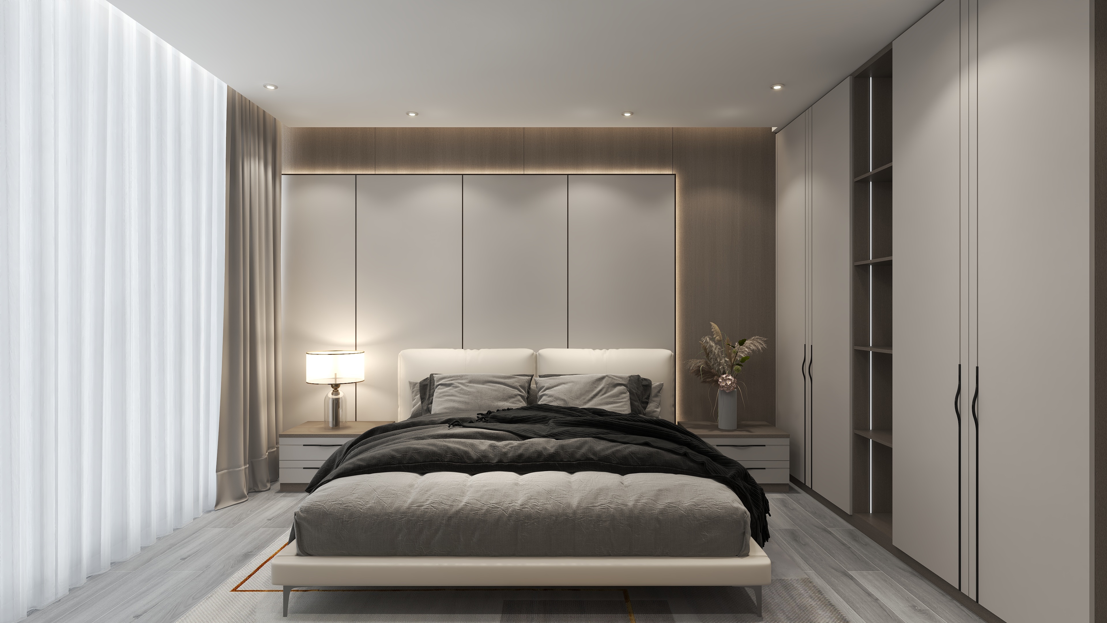 米蘭之吻係列,采用一體式櫃體布局,整體動線順暢開闊。在以舒適為原則的基礎上,臥房護牆板及衣櫃的櫃門采用“嬌月白”與“優雅暖灰”構築靜謐的底色,櫃體采用“流光漫步”花色搭配。衣櫃PVC吸塑櫃門拋棄繁複的歐式紋飾,采用簡歐線型,運用小邊框勾勒出線條靈動之美,一改傳統櫃門一平到底的單調印象。“優雅暖灰”花色打造的格柵立體造型護牆板,自帶高顏值的視覺享受。床頭背景牆隱藏式燈帶漫射暖光,溫馨之外更顯視覺層次感。