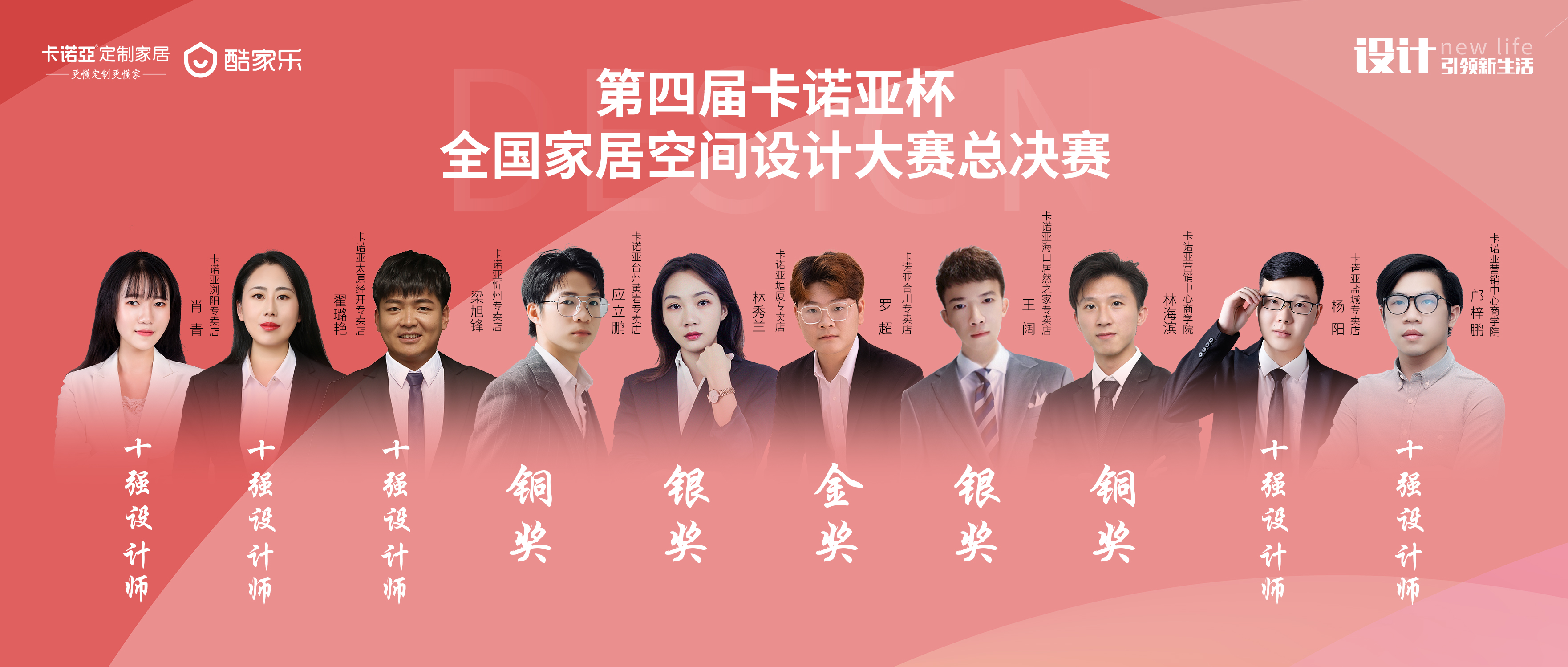 經過評委評分匯總統計,本次決賽金銀銅獎得主誕生,他們分別是:金獎得主合川專賣店羅超,銀獎得主塘廈專賣店林秀蘭、海口居然之家專賣店王闊,銅獎得主營銷中心商學院林海濱、台州黃岩專賣店應立鵬;年度優秀設計獎得主是:忻州專賣店梁旭峰、瀏陽專賣店肖青、營銷中心商學院鄺梓鵬、太原經開專賣店翟璐豔、鹽城專賣店楊陽。